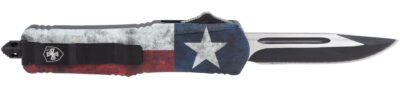Medium 3″ Drop Point SL/Part Serrated Black Handle OTF, D2 Steel, Hard Plastic case, Nylon Pouch