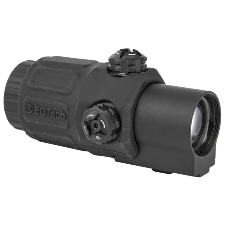 The G33STS from EOTech is a Gen III Magnifier with a Switch to Side (STS) mount, tool-free azimuth adjustment and an adjustable diopter for precise focusing. G33 is shorter and lighter than the G23, with an improved mount for faster 3x to 1x transitioning and a larger field of view. It is fogproof, temperature rated for -40 to +160 degrees F, and waterproof to 10 meters. The Quick STS mount twists the magnifier out of the way for shorter range shots, locking in that position until pushed back into place for magnified viewing.The G33 also offers a locking, quick detach lever for the optic and the mount. It aligns with standard-height sights, and comes with a 7mm riser to accommodate raised sights.