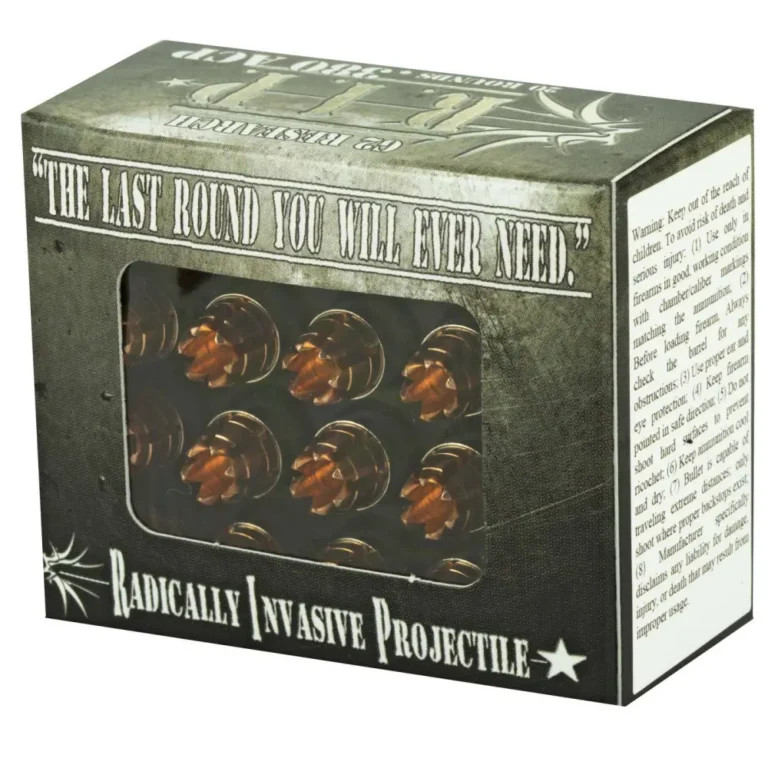 The G2 Research Radically Invasive Projectile (RIP) bullet is a copper hollow-point with the tip of the bullet consisting of eight trocar-shaped petals upon impact, acts similar to a holesaw. RIP bullets act like a FMJ on impact in solid objects and as the bullet passes through soft tissue it expends its energy. The design allows for an ease of entry by reducing the deceleration at the point of impact, causing potential energy to be conserved.
