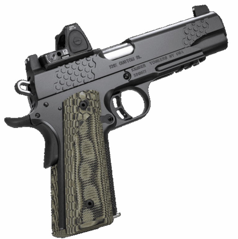 KHX Custom .45ACP, 5″, Black Pistol, Trijicon RMR, White Dot Cowitness Sights, 8rd Magazine, Hogue G-10 Magwell Grips 1x8rd Mag