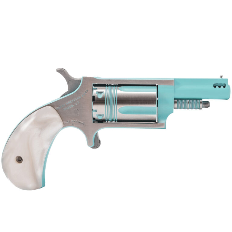 NAA .22MAG SA 1.63″ Barrel 5 Shot Capacity IRIS NAA .22MAG SA 1.63″ Barrel 5 Shot Capacity Iris Ported Turquois cerakote White Grips