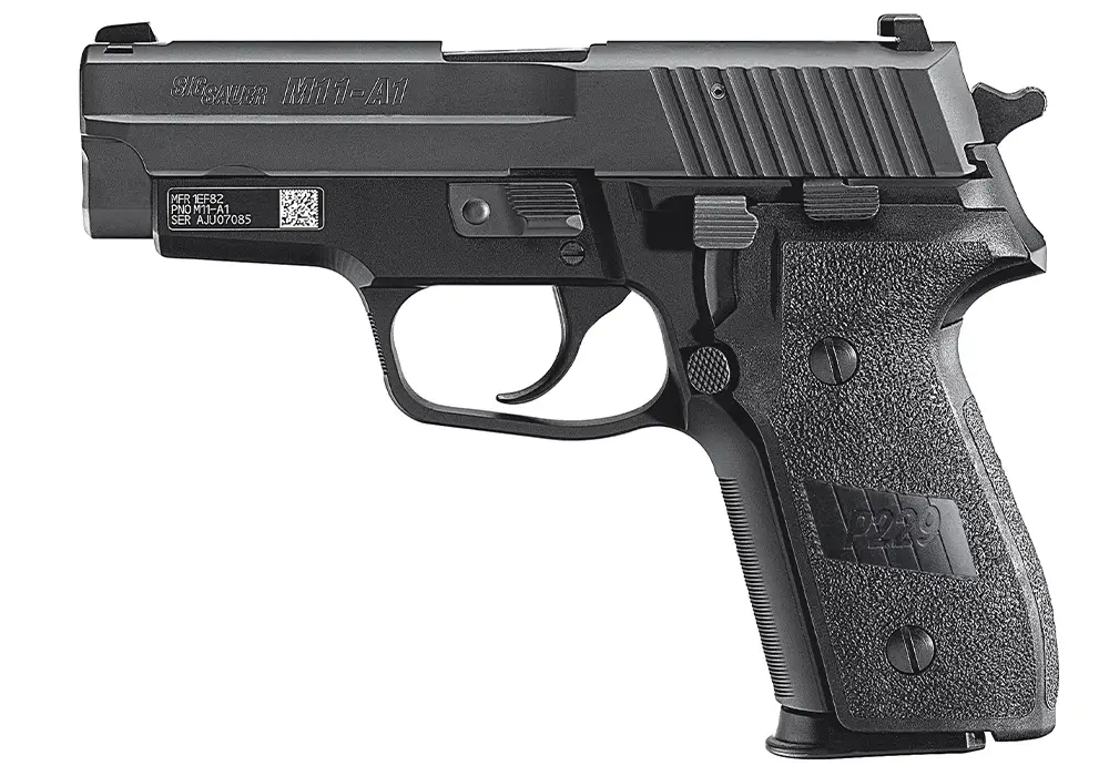 The Compact M11-A1 model performs like no other 9mm available. Its internal parts and controls are phosphated for extreme corrosion resistance and reduced friction while the barrel has a nitron finish. The P229 M11-A1 Compact also has vertical front strap serrations and SigLite night sights.