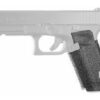 Talon Grips for Glock Gen 5 Models 17, 19X, 22, 34 and 45 with the Medium Backstrap installed. This rear wrap grip is in the rubber texture. This grip provides full coverage on the side panels including above the thumb rest, ample coverage on the backstrap, and three finger wraps for the finger groves under the trigger guard. This grip has a logo cutout for the Glock emblem on the left side. This grip sticks extremely well even with the Rough Textured Frame (RTF). Talon Grips are 100% Made in the USA. Adhesive material is less than 0.5mm thick.