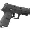 Talon Grips for Sig Sauer P250 and P320 9mm/.357/.40./45 Compact with the medium grip module. This rear wrap grip is in granulate texture and offers full side panel coverage including the thumb rest area, full coverage under the trigger guard, and high coverage on the backstrap. This grip has a graphic cutout for the Sig Sauer emblem. Adhesive material is less than 0.5mm thick.